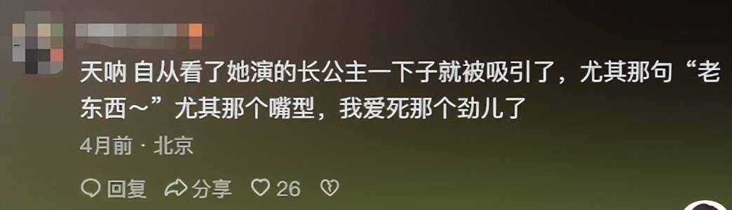 “自从看了她演的长公主,一下子就被吸引了,尤其那句‘老东西’,尤其那个嘴型,我爱死那个劲儿了。”